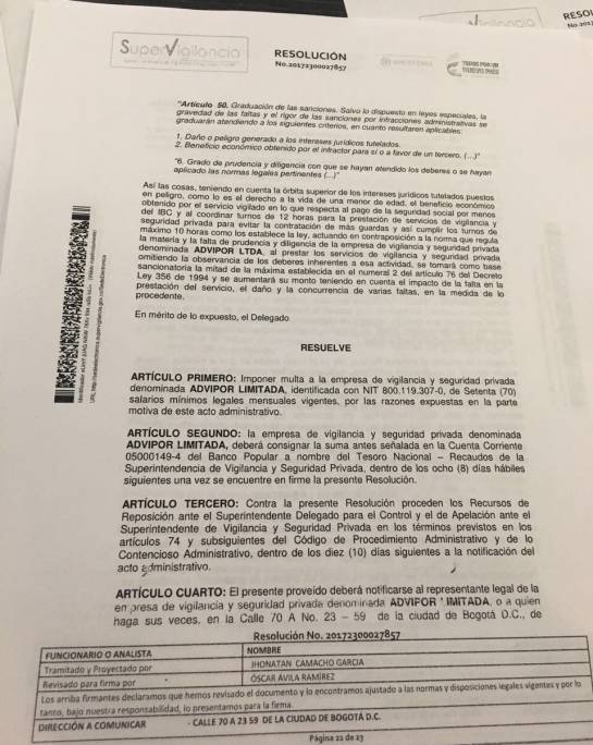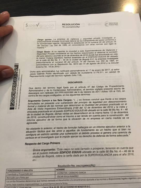 El superintendente Israel Londoño le confirmó a este medio que son cuatro los cargos que en contra de Advipore. Uno de ellos, no reportaron a tiempo el ingreso a la fuerza de Yuliana Samboní por parte de Rafael Uribe Noguera y los hechos acontecidos. Además, porque excedían los horarios laborales de los vigilantes, la vigilancia no contaba con los cursos académicos al día. Y además porque no tenían información actualizada de sus funcionarios.